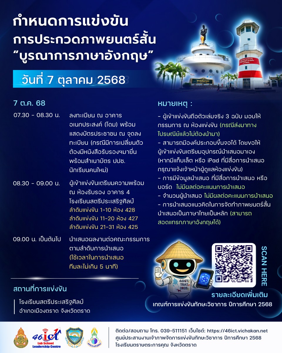 หนังสือแจ้งกำหนดการแข่งขันใหม่เป็นวันที่ 6 - 8 ตุลาคม 2568 งานมหกรรมวิชาการ 46 ICT ประจำปี 2568