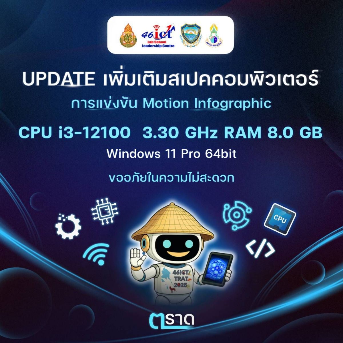 เนื่องจากมีผู้เข้าแข่งขันให้ความสนใจในรายการ การแข่งขันการออกแบบกราฟิกด้วยคอมพิวเตอร์  (Motion Infographic)  เป็นจำนวนมาก  ทางคณะผู้จัดจะเตรียมเครื่องคอมพิวเตอร์สําหรับใช้ในการแข่งขันให้ทีมละ 1 เครื่อง  โดยใช้วิธีการจับฉลากห้องและเครื่องคอมพิวเตอร์ในการแข่งขัน   ส่วนสเปคคอมพิวเตอร์จะแจ้งให้ทราบอีกครั้ง